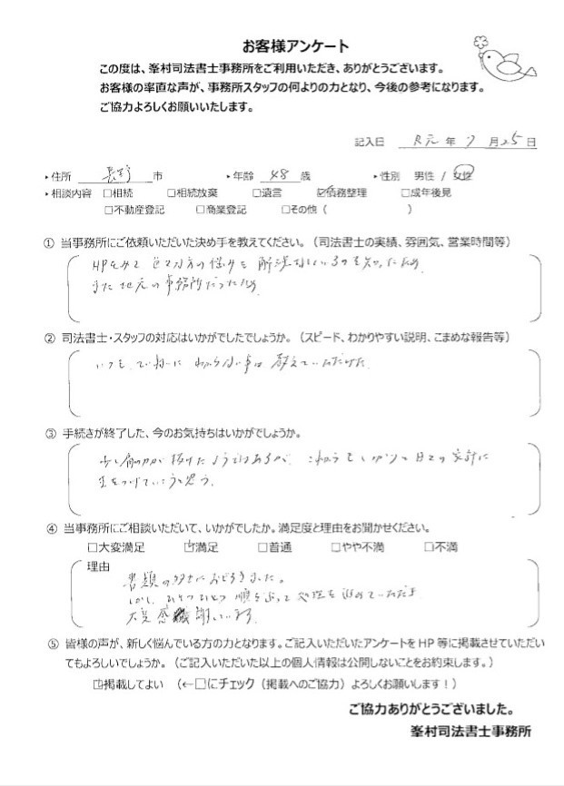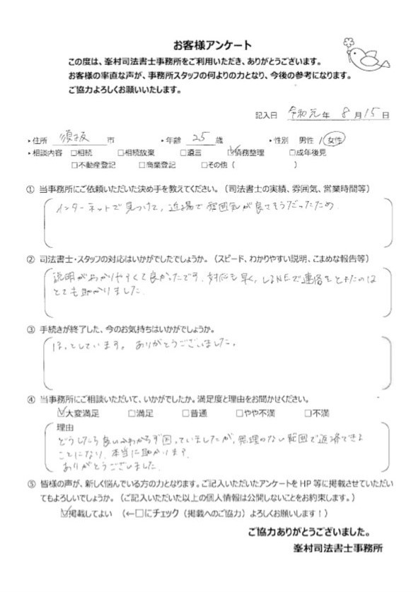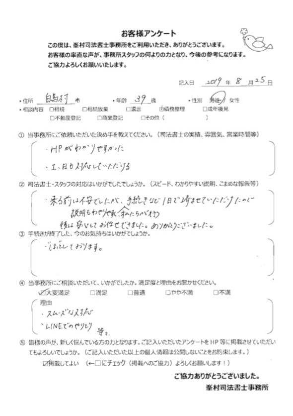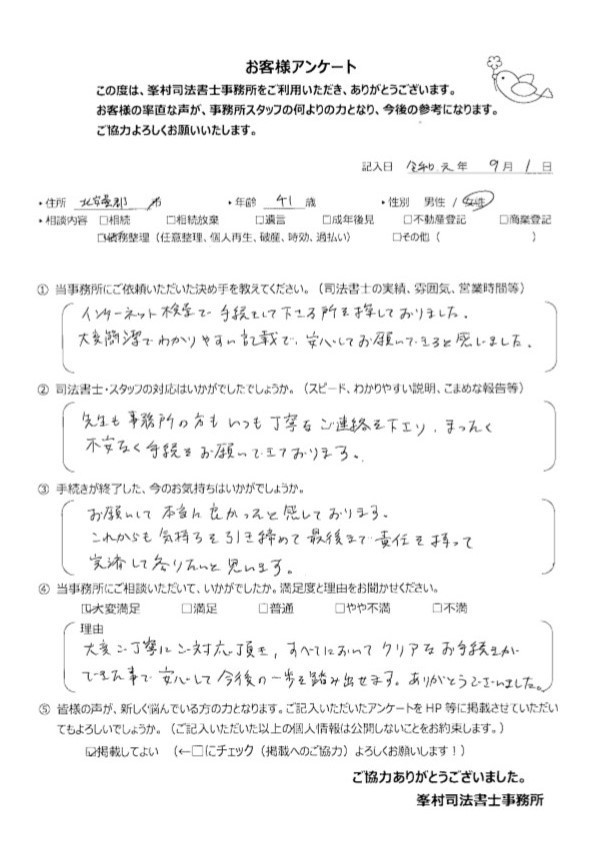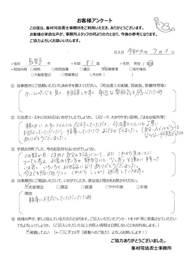 A親切にスタッフさんにも対応していただき、司法書士さんにも丁寧に対応していただいたり、指導していただき、お任せできました。(自分一人ではどうにもならない状況でしたので)ありがとうございました。