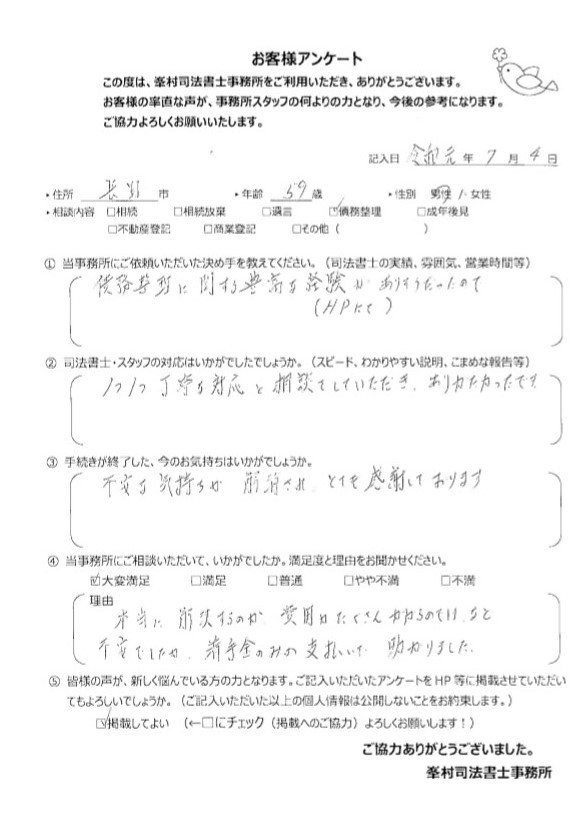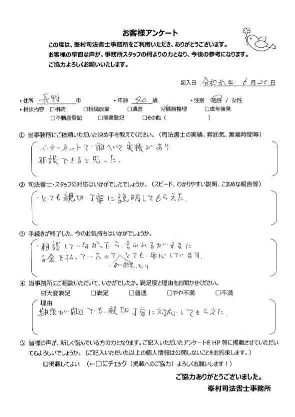 裁判所への提出書類は大変多いため、ご本人様の前向きな協力が必要不可欠となります。この度、ご本人様の努力が認められた結果となり、大変嬉しく思います。家計を見直され、節約に励まれていました。今後も、返済代行を通してお手伝いさせていただきます。