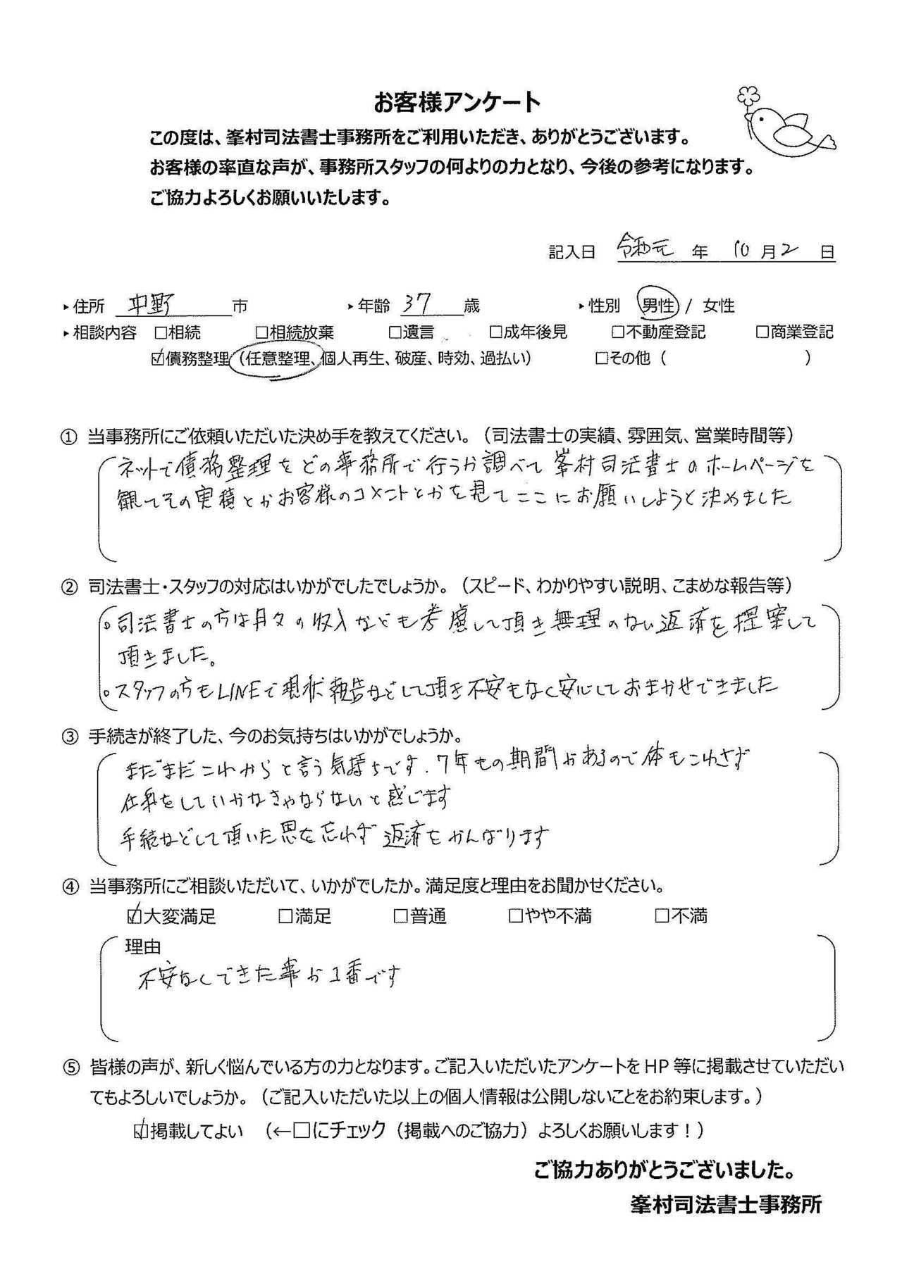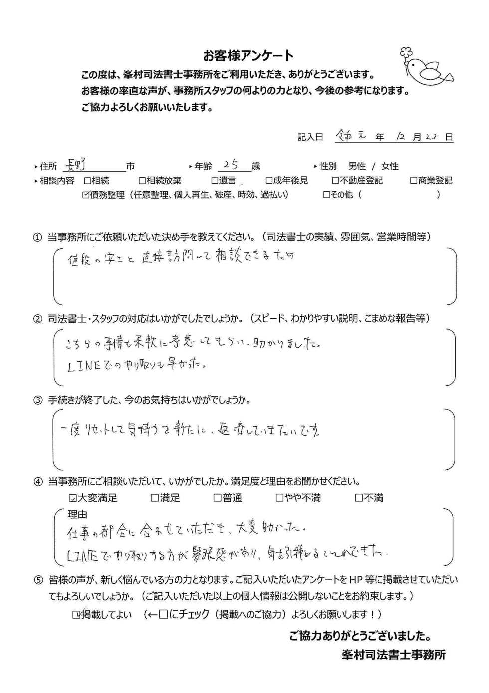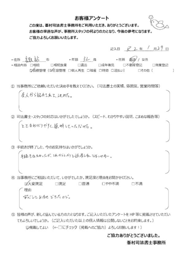 A司法書士の方は、月々の収入なども考慮していただき、無理のない返済を提案していただきました。スタッフの方もLINEで現状報告などしていただき、不安もなく安心してお任せできました。