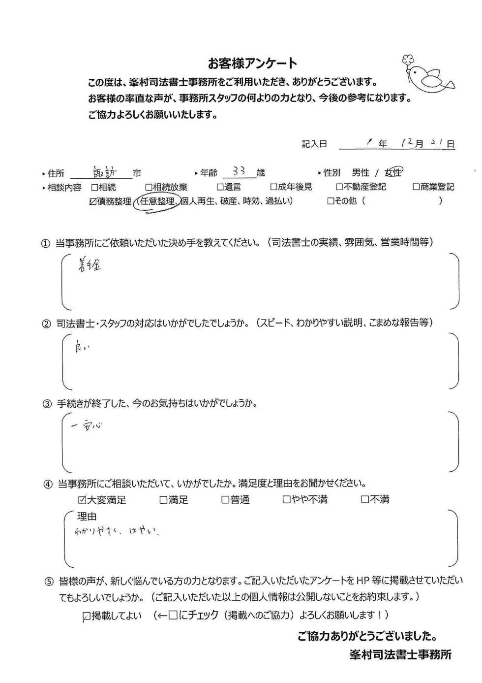 無事に免責され、安心いたしました。受任後3か月以内の申立をするスピードパックでの受任のお客様でした(通常6か月)。お客様のご事情を伺い、最善の方法で手続きを進めます。ご相談の際は、遠慮なく、納得されるまでご質問いただきたく存じます。