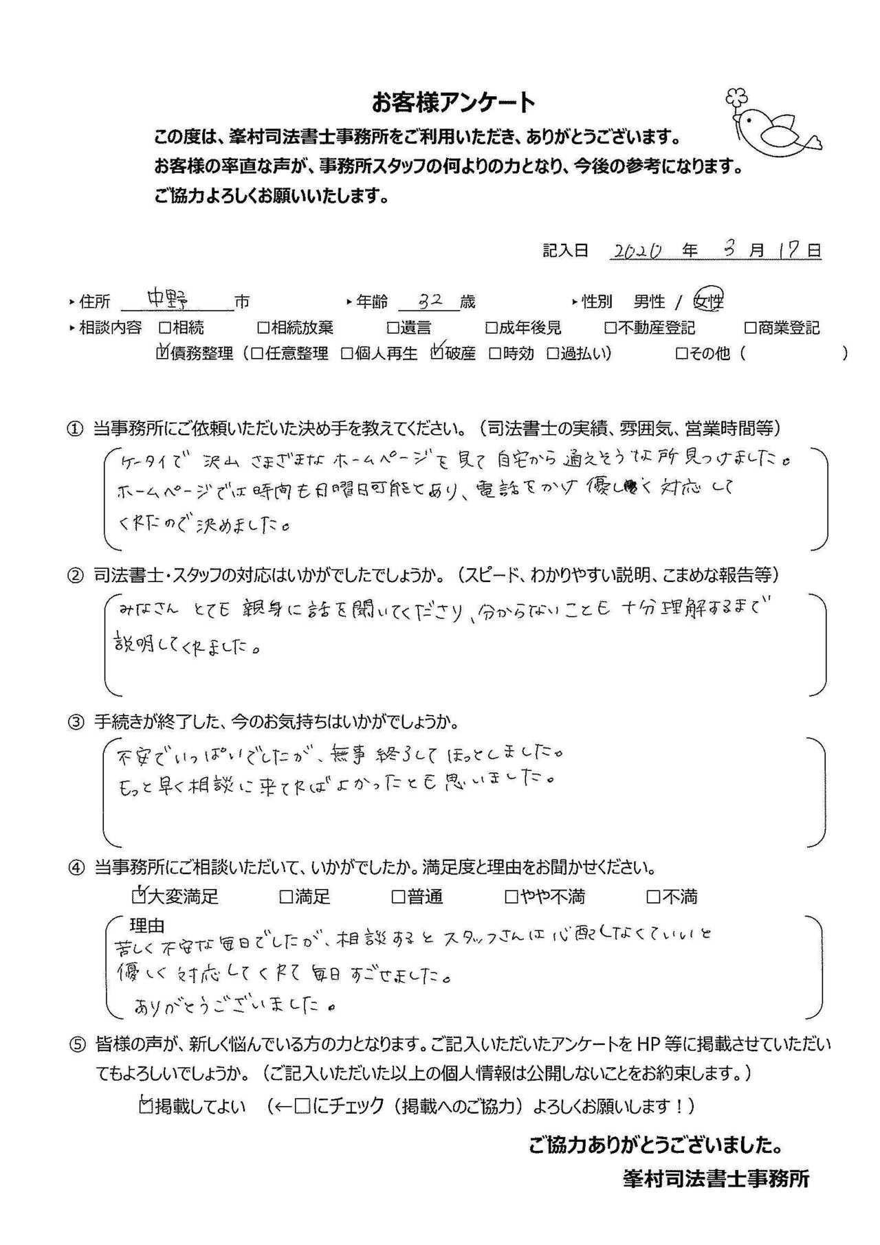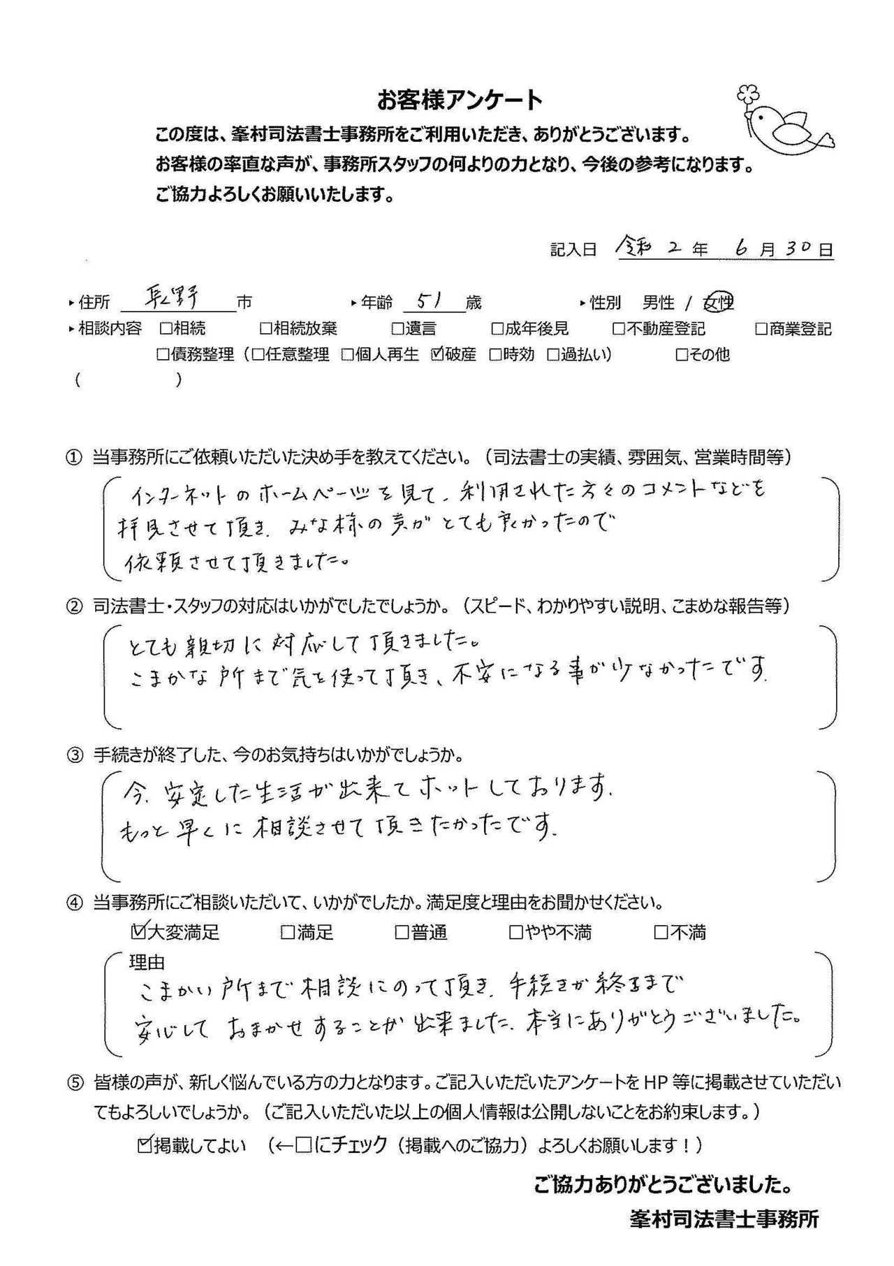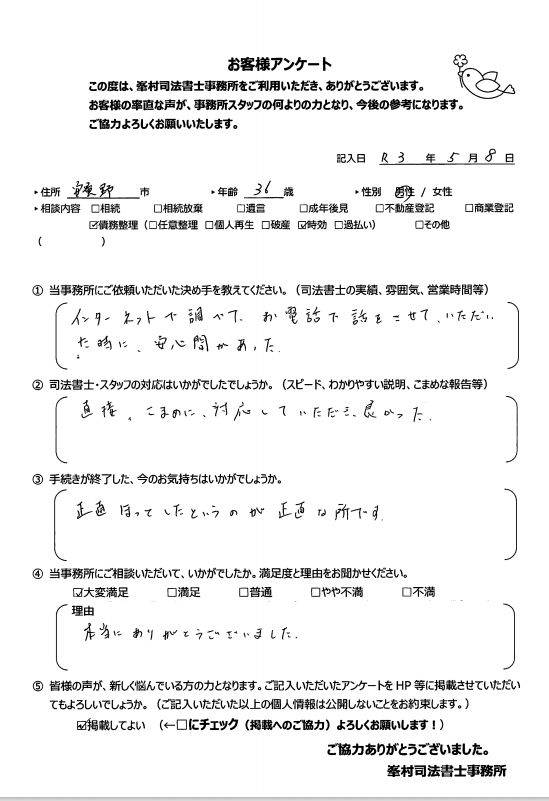 自営業をされていたお客様で、管財事件になりました。そのため免責が確定するまで長期間かかりましたが、都度きちんと書類をご準備頂けたので、当方も対応が進めやすかったです。ご満足いただけるかたちで終えられ、うれしく思います。