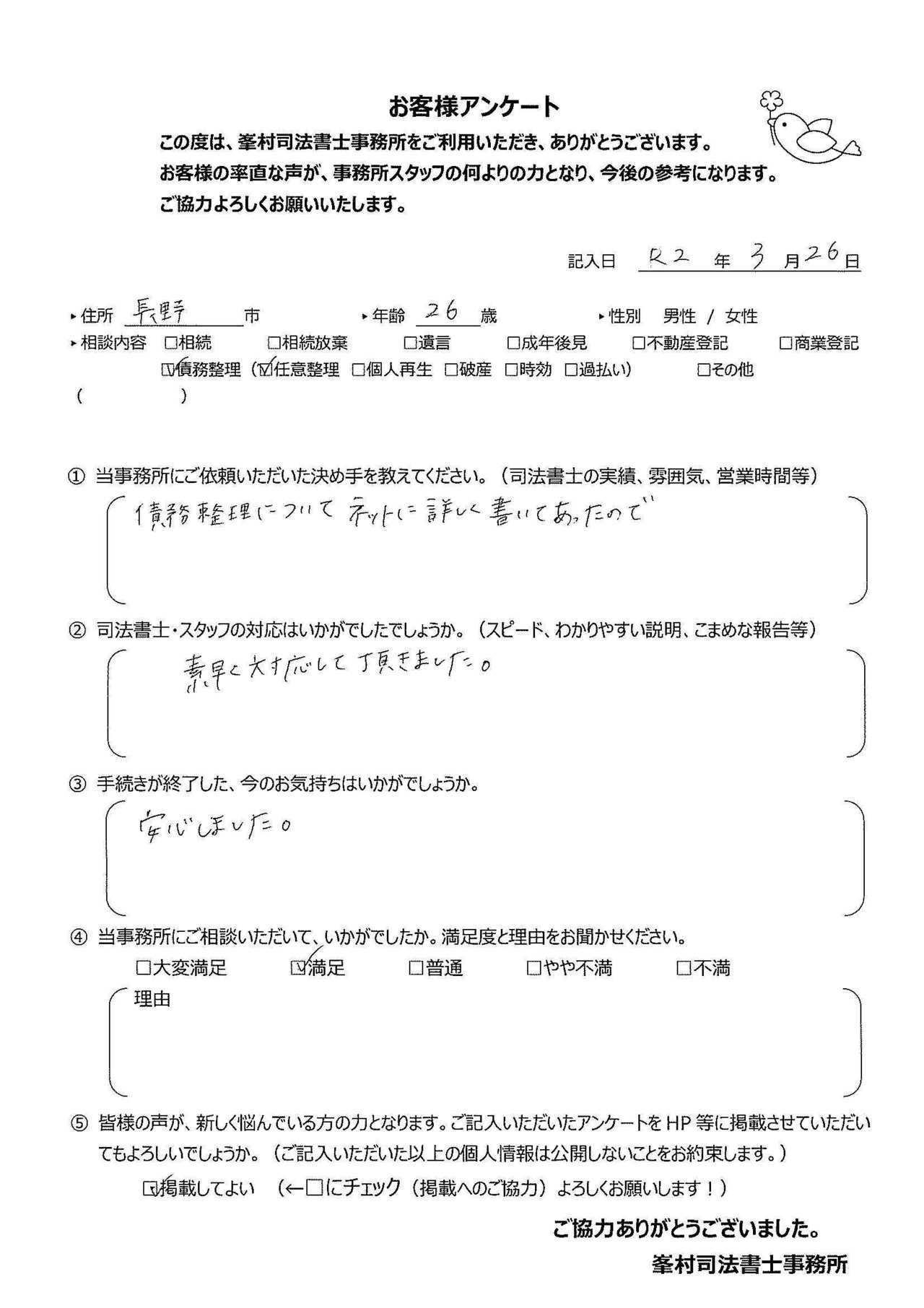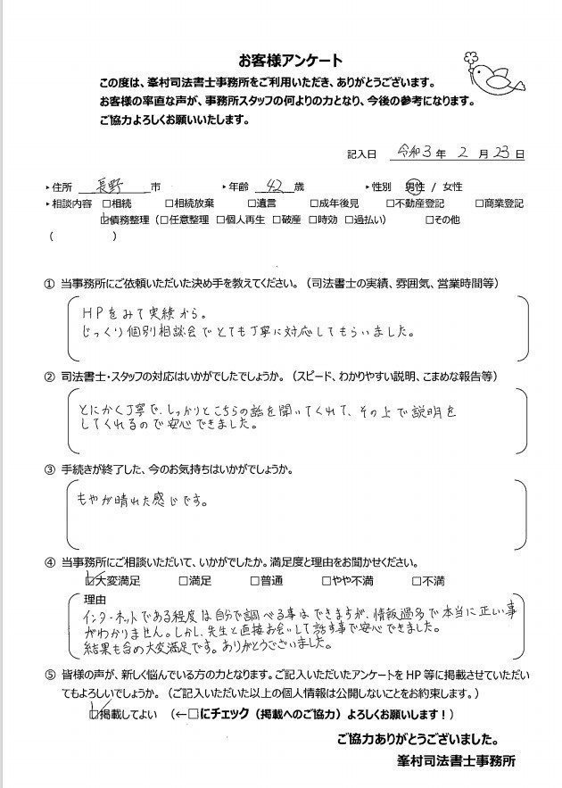 受任から1年以上の対応となりました。途中大変な部分もありましたが、ご本人も積極的かつ真摯に取り組んでくださったので、無事に終了することができました。これからの再スタート、心より応援しております。